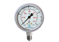 本公司不锈钢压力表品种规格也十分齐全。材质有304和316不锈钢。主体有¢40、¢50、¢60、¢75、¢100、¢150。测量范围:从-0.1~0、-0.1~0.06、-0.1~0.15、-0.1~0.3、-0.1~0.5、-0.1~0.9、-0.1~1.5、-0.1~2.4、0~0.1、0~0.16、0~0.25、0~0.4、0~0.6、0~1、0~1.6、0~2.5、0~4、0~6、0~10、0~16、0~25、0~40、0~60。不锈钢压力表对于接头螺纹尺寸常规的M14×1.5、M20×1.5,也可以按照客户需求定制螺纹尺寸。精度等级分为2.5级和1.6级。安装方式有:径向无边、径向后边、轴向无边、轴向前边、卡子式。